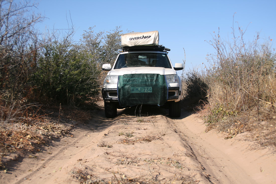 Je weiter wir in der Zentral Kalahari voran kamen, umso mehr drängte sich der Busch wie ein Korridor an die Piste, so dass er links und rechts schrecklich mit den Ästen und Dornen am Auto kratzte. Eine Qual für Lack und Ohren! Doch an Umkehren war nicht zu denken. Wo denn auch? Wir fuhren über Stunden ohne Pause durch eine Buschschneise. Nachdem Marcel kurz für wenige Meter beschleunigen konnte, folgte eine Bodenwelle, die den Fordofant in die Lüfte hob um danach hart auf dem Boden aufschlagen zu lassen. Ein kurzer dumpfer Schlag, Marcel bremste ab und dann Stille. Wir stiegen aus um nachzuschauen ob alles noch in Ordnung ist. Der 40 Liter Dieselkanister hatte es vom Dach geworfen und direkt das Canopyfenster eingedrückt. Ja wo ist den das Glas von unserem Canopy (Glasfaser-Verdeck über der Pick-up Ladefläche)?